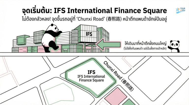 จุดขึ้นอยู่โซน Chunxi Road/IFS (ใต้แพนด้า IFS) เป็นจุดยอดนิยมของสาย Airport Express และ “ให้ดูป้าย/จุดขายตั๋วหน้างาน” เพราะข้อมูลจุดจอดมีการปรับย่อยได้ตามช่วงเวลา/นโยบายเมือง