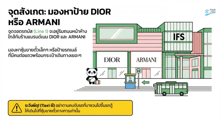 สังเกตุป้าย DIOR หรือ ARMANI หรือ ARMANI จุดจอดรถบัส (Line 1) จะอยู่ริมถนนหน้าห้าง ใกล้กับร้านแบรนด์เนม DIOR และ ARMANI มองหาซุ้มขายตั๋วเล็กๆ หรือป้ายรถเมล์ ที่มีคนต่อแถวพร้อมกระเป๋าเดินทางเยอะๆ