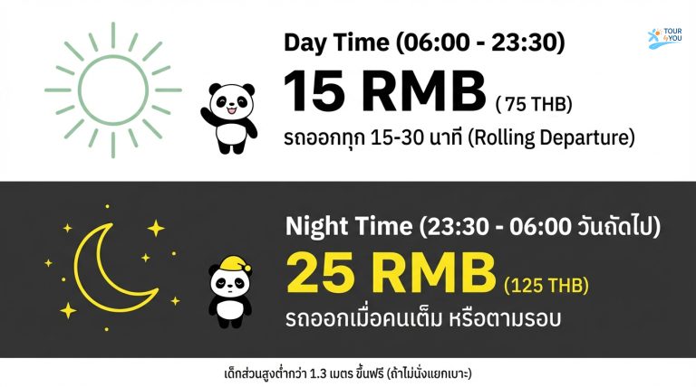 Day Time (รอบเช้า) : (06:00 – 23:30) : ราคา : 15 RMB (75 THB) : รอบรถ : ออกทุก 15-30 นาที (Rolling Departure)