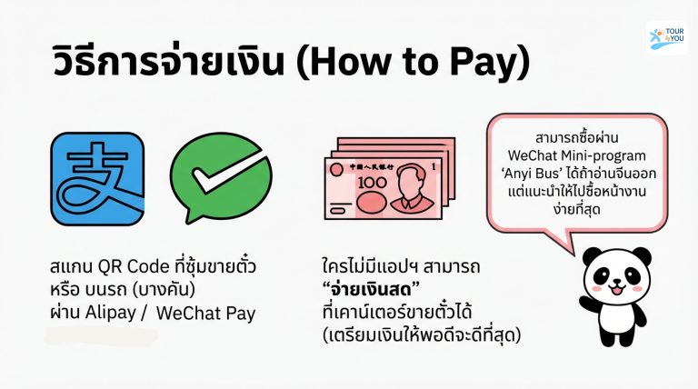 วิธีการจ่ายเงิน (How to Pay) : สแกน QR Code ที่ซุ้มขายตั๋ว หรือ บนรถ (บางคัน) : ผ่าน Alipay / WeChat Pay / เงินสด