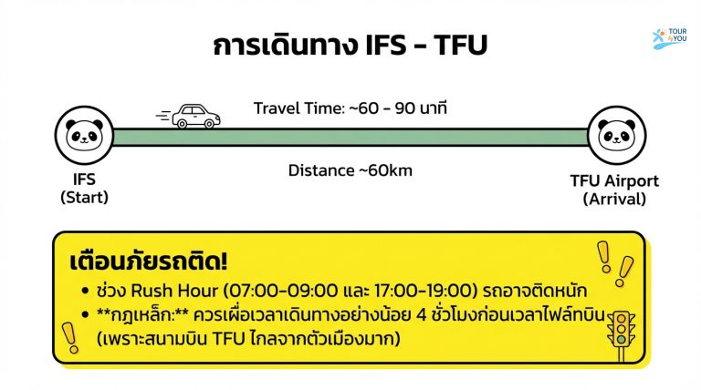 การเดินทาง IFS – TFU Travel Time: ~60 – 90 นาที Distance ~60km “ขึ้นกับช่วงเวลา/รถติด” และควรเผื่อเวลาเดินทาง